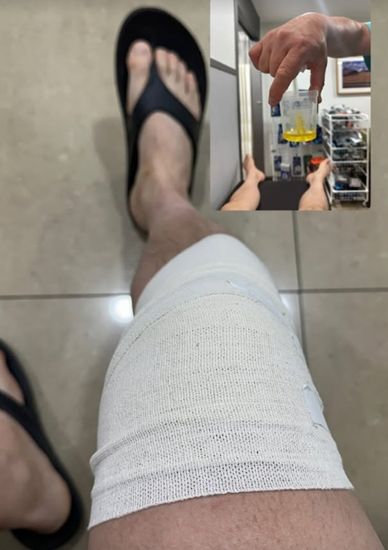 사진 속 이루는 무릎에 붕대를 감고 있어 눈길을 끌었다. 그는 무릎에 물이 차 치료를 받은 것으로 보인다.