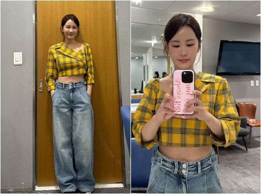 김지민은 2일 자신의 개인계정에 셀카를 올린 후 "크롭티 어울리는군"이라고 썼다. 공개된 사진 속 김지민은 청바지에 노란색 체크무늬 크롭티를 매치, 화사한 모습이다.