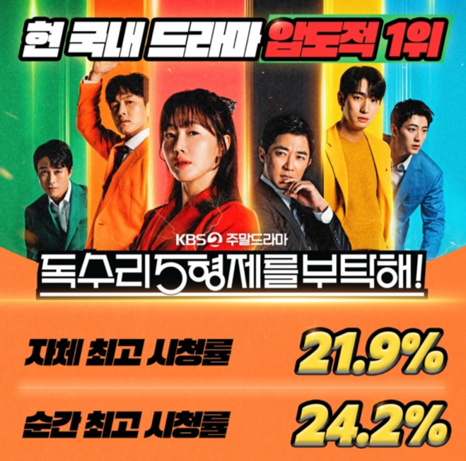엄지원과 안재욱의 로맨스가 본격적으로 불붙는 후반부 스토리에 시청자들의 기대가 더욱 고조되고 있는 '독수리 5형제를 부탁해'는 매주 토요일, 일요일 오후 7시 55분 방송된다.