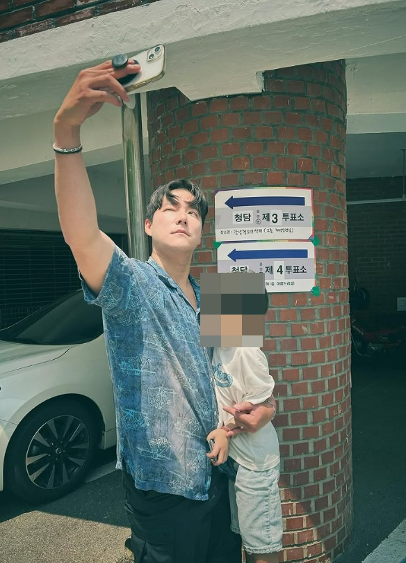 사진 속 조태관은 투표소 앞에서 가족을 기다리며 아들을 안고 셀카를 찍고 있었다.