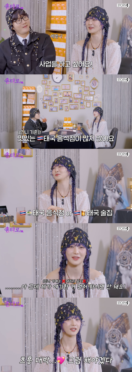 이용진은 민니가 뽑은 카드를 보며 "나중에 좋은 사람을 만나서 좋은 시간을 보내다가 결정적인 순간이 되면 결혼에 대한 생각이 사라질 수도 있다"고 점괘를 분석했다.