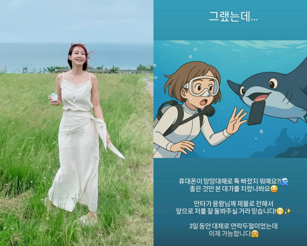 이와 함께 오정연은 "휴대전화가 망망대해로 톡 빠졌다. 좋은 것만 본 대가를 치렀나보다. 만타가 용왕님께 제물로 전해서 앞으로 저를 잘 돌봐주실 거라 믿는다"고 털어놨다.