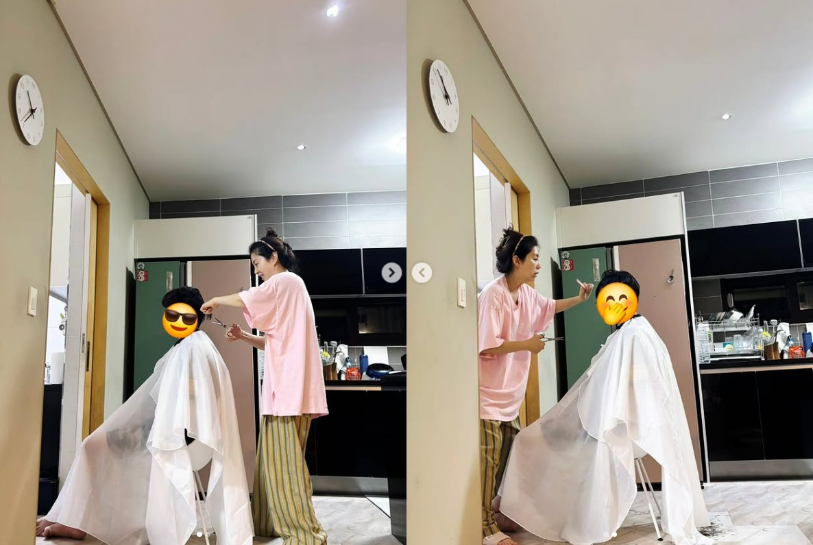 사진 속 송윤아는 화장실 앞에서 아들로 보이는 자녀의 헤어 스타일을 변신시키고 있는 모습. 그는 미용사 자격증이 없음에도 수준급 커트 실력을 자랑하며 보는 이들을 깜짝 놀라게 만들었다.