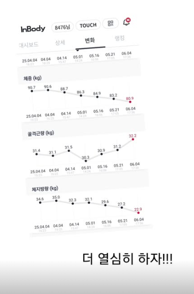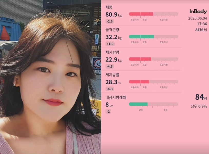 사진 속 박수지의 인바디 결과에 따르면 몸무게 80.9kg를 나타내며 시선을 모은다. 또한 체지방량도 4월 34.6kg에서 2개월 만에 22.9kg로 무려 12kg 감량에 성공했다.