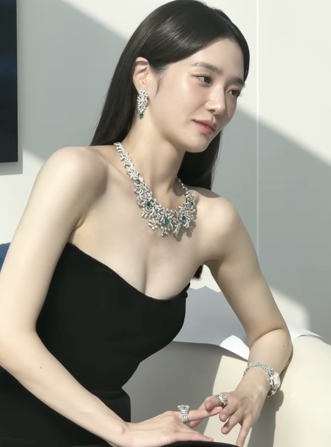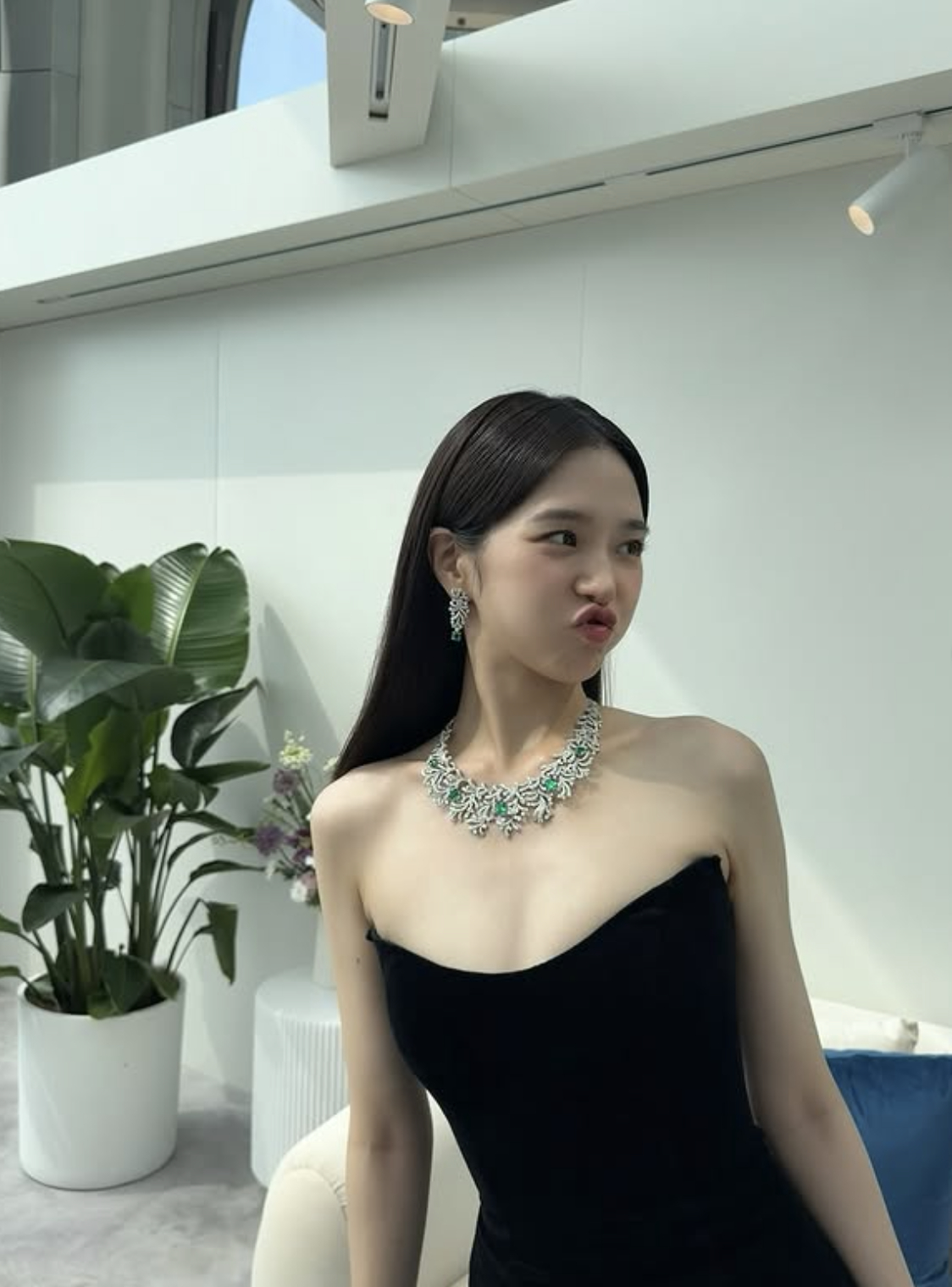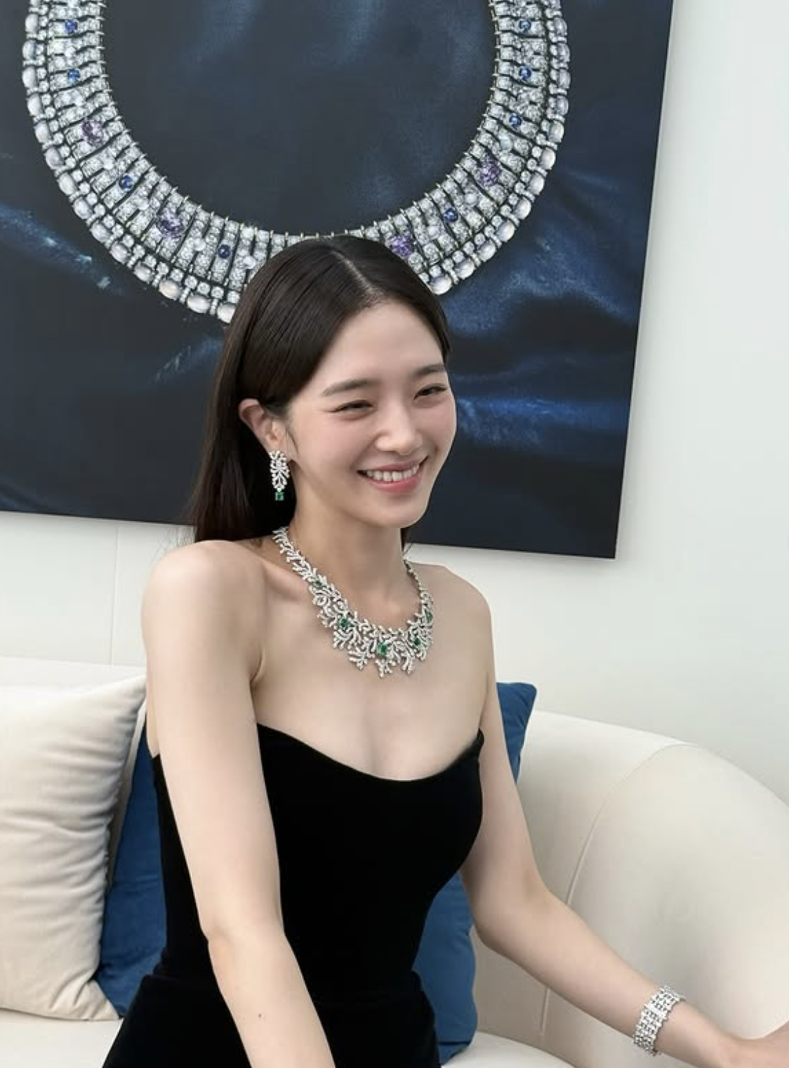 해당 사진에서 그는 깊게 파인 블랙 드레스를 입고, 볼드한 디자인의 하이엔드 목걸이를 매치해 강렬한 존재감을 드러냈다.