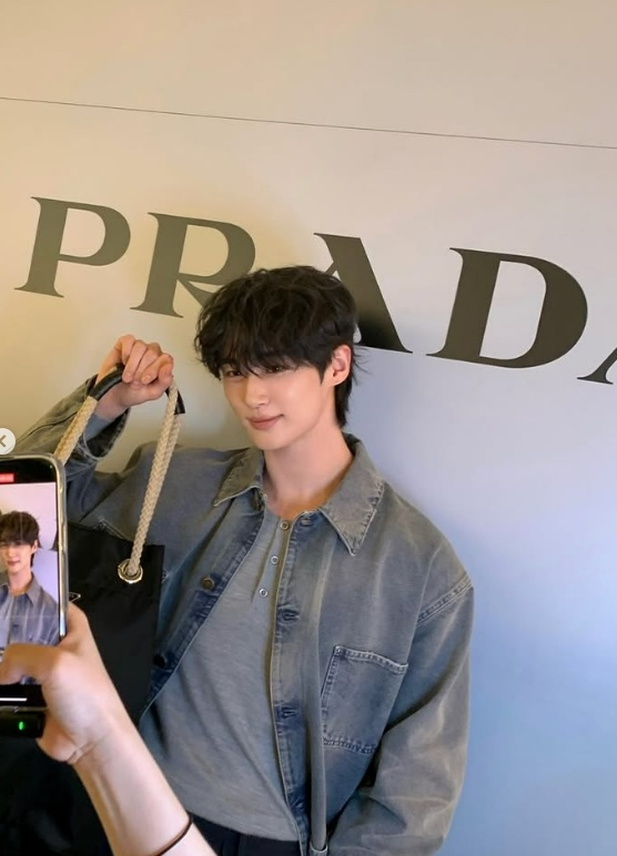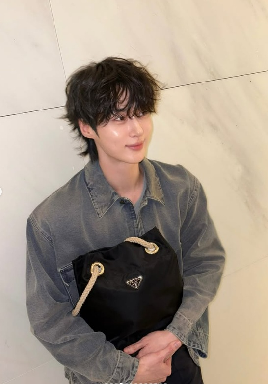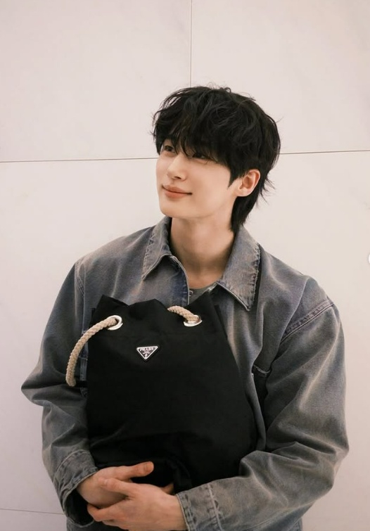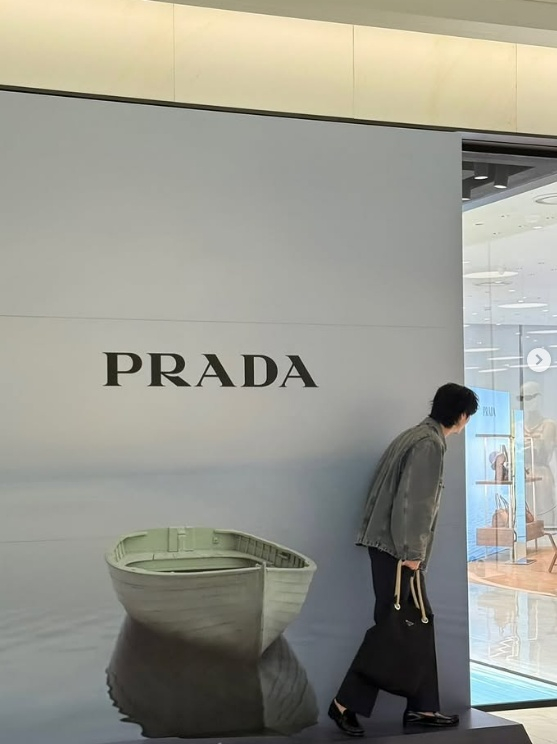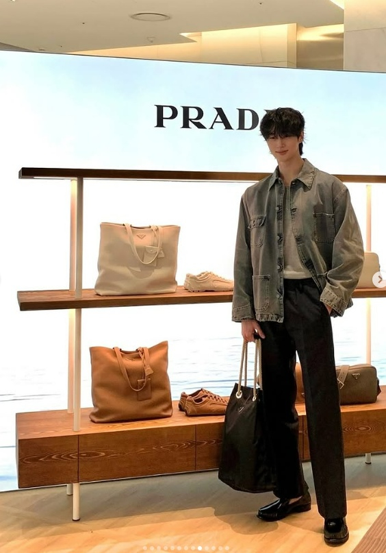 그는 여기에 프라다의 신상백을 안고 은은하게 미소지으며 포즈를 취했다.