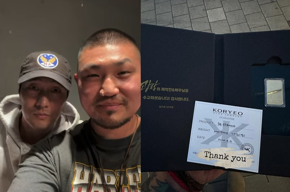 던밀스는 7일 자신이 출연한 넷플릭스 시리즈 '광장' 비하인드 컷을 공개하고 소지섭으로부터 받은 금 한돈을 공개했다.