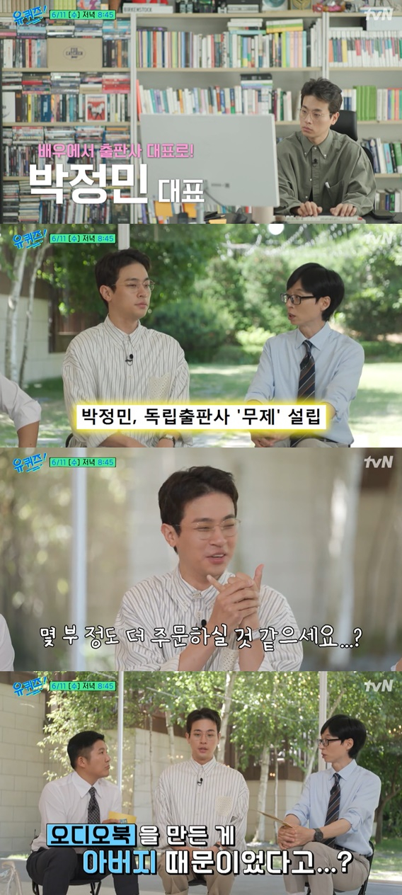 김금희 작가 장편소설 '첫 여름, 완주'를 출간한 박정민은 '유 퀴즈' 출연에 앞서 신간 인쇄를 늘렸다고 밝히며 "서점에 전화해서 '제가 유 퀴즈에 나가는데 몇 부 정도 주문하실 것 같나'라고 물었다"고 유쾌하게 고백했다.