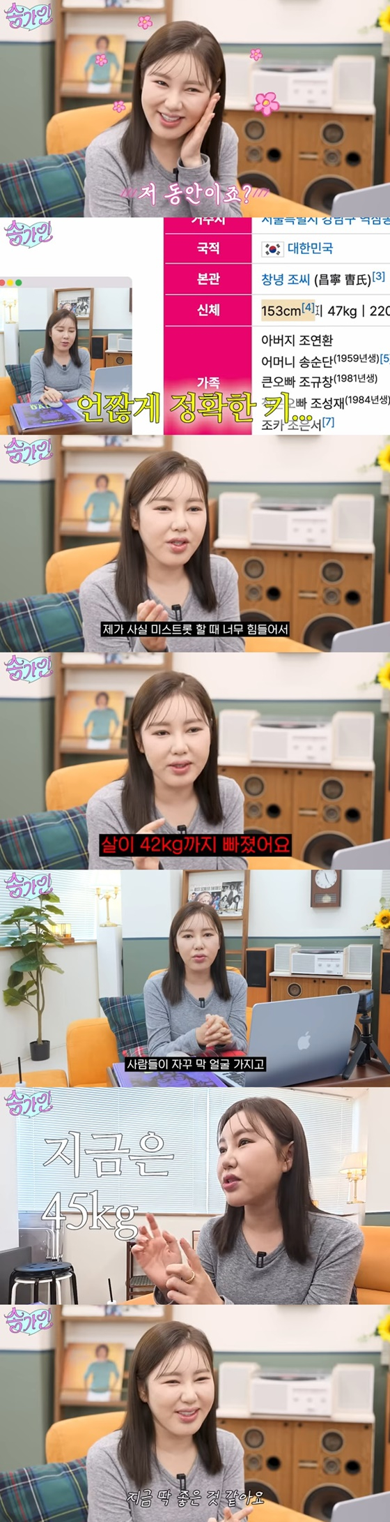 송가인의 프로필에는 몸무게가 47kg로 기재돼 있었다. 이를 본 송가인은 "47kg는 평균 몸무게"라며 "TV조선 '미스트롯' 당시에는 힘들어서 42kg까지 빠져서 화면이 예쁘게 나왔다"고 전했다.