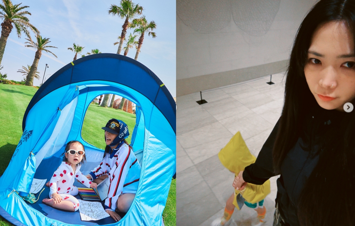 공개된 사진 속에는 남편, 딸과 함께 나들이에 나선 허니제이의 모습이 담겼다. 세 가족은 함께 캠핑하는가 하면, 수영장에 방문해 행복한 시간을 즐겼다.