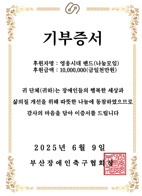 영웅시대밴드 나눔모임의 후원금은 부산뇌성마비 축구팀 전지훈련비로 사용될 예정이다.