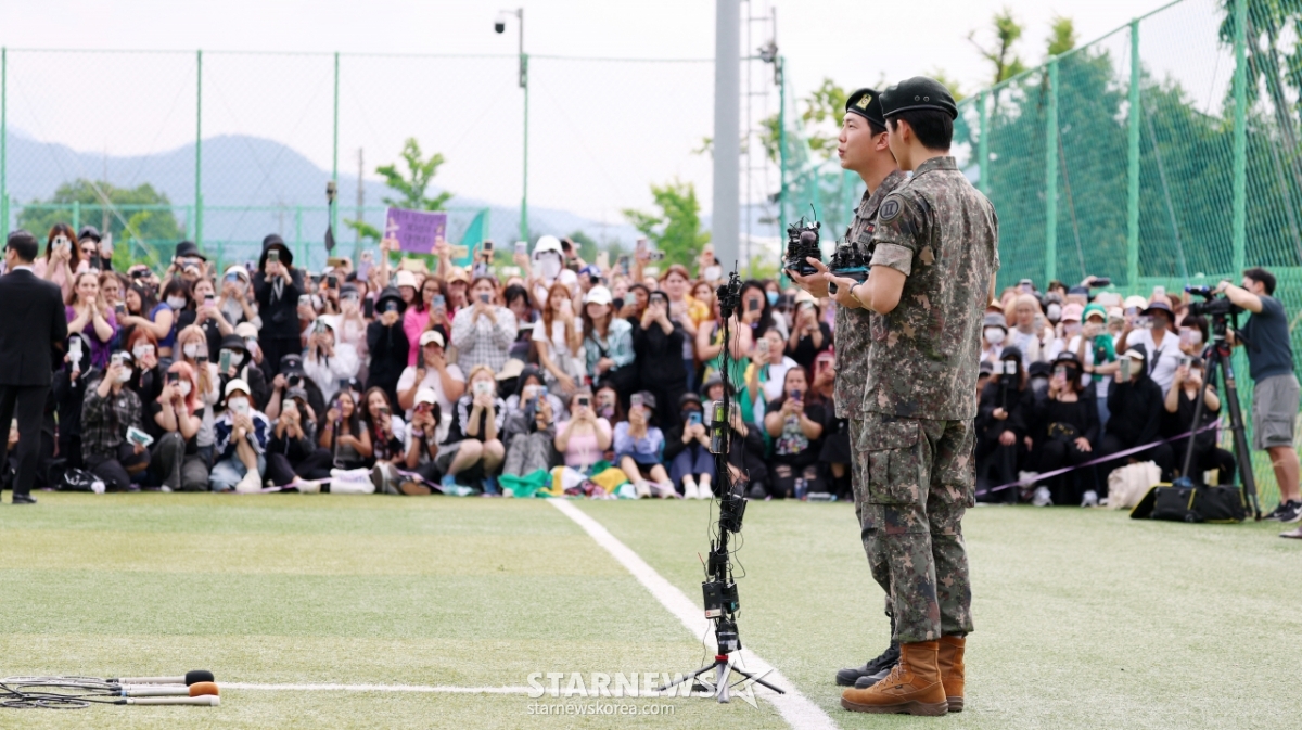 연예방송RM-뷔, 군생활 힘들었지만 멋지게 복귀[★포토]발행 : 2025.06.10 ・ 09:47수정 : 2025.06.11 ・ 13:36춘천(강원)=김휘선 기자육군 제15보병사단 군악대로 복무한 RM, 육군 제2군단 군사경찰 특수임무대로 각 복무를 마친 뷔가 10일 오전 강원 춘천시 신북읍체육공원에서 전역 소감을 전하고 있다./2025.06.10<저작권자 © 스타뉴스, 무단전재 및 재배포 금지>BTSRM전역강원춘천시신북읍추천 기사김휘선 기자기자홈좋아요 연예-방송의 인기 급상승 뉴스연예-방송의 최신 뉴스