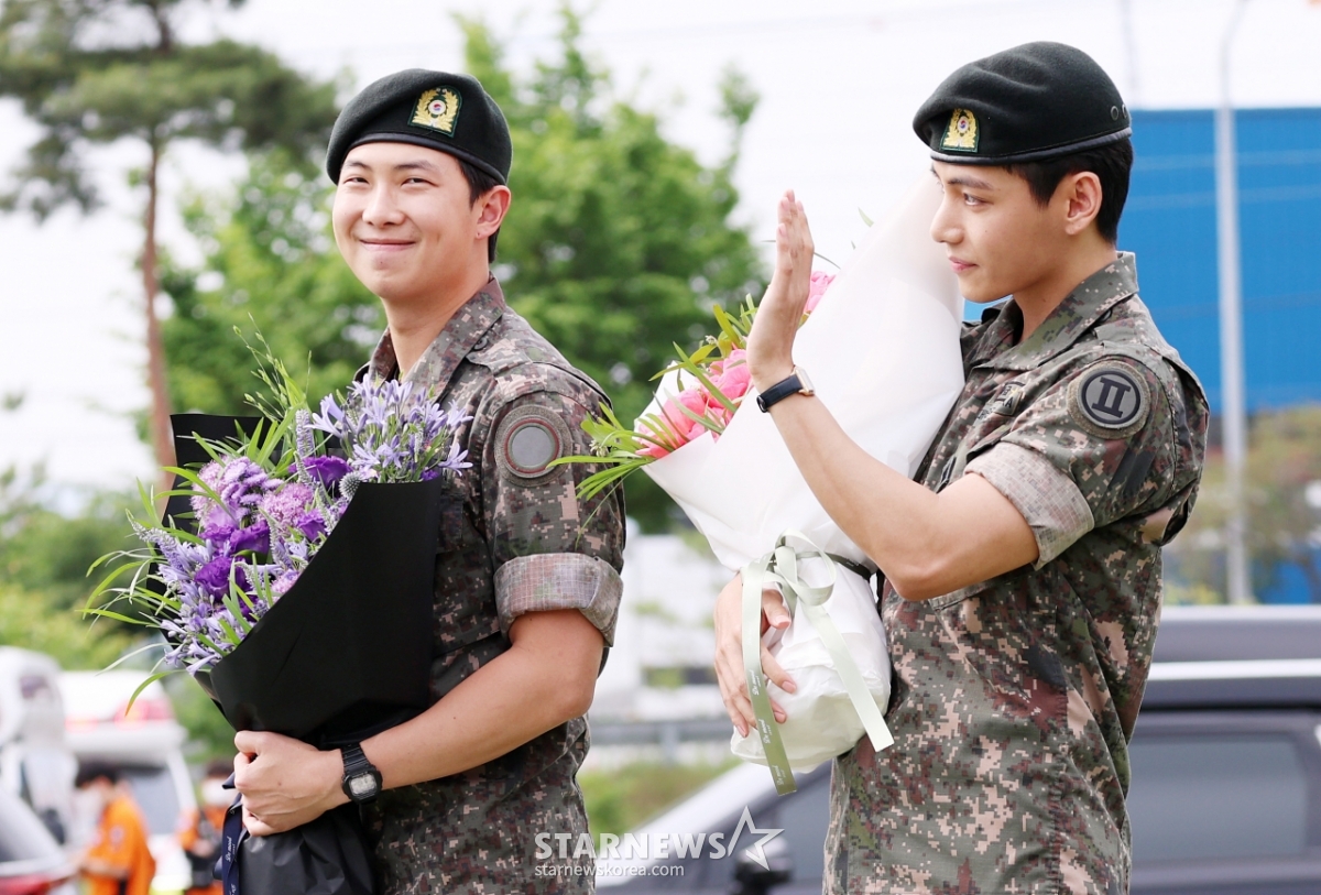 연예방송RM-뷔, 행복한 전역 날[★포토]발행 : 2025.06.10 ・ 10:05수정 : 2025.06.11 ・ 13:33춘천(강원)=김휘선 기자육군 제15보병사단 군악대로 복무한 RM, 육군 제2군단 군사경찰 특수임무대로 각 복무를 마친 뷔가 10일 오전 강원 춘천시 신북읍체육공원에서 팬들에게 인사를 하고 있다./2025.06.10<저작권자 © 스타뉴스, 무단전재 및 재배포 금지>BTSRM전역강원춘천시신북읍추천 기사김휘선 기자기자홈좋아요 연예-방송의 인기 급상승 뉴스연예-방송의 최신 뉴스
