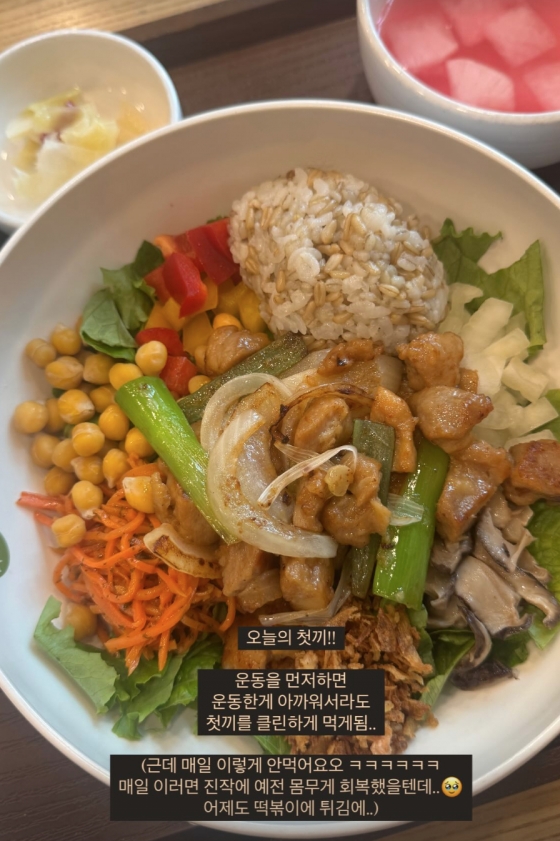 이다은은 "운동만 하면 얼굴이 붉다 못해 검붉어짐. 천국의 계단 태어나서 처음 타봄. 20분. 나랑 잘 안맞는 걸로. 계속 하다간 운동과 평생 절연할 판"이라고 덧붙였다. 이어 이다은은 "오늘의 첫끼"라며 다이어트 식단도 공개하고 "운동을 먼저하면 운동한 게 아까워서라도 첫끼를 클린하게 먹게 됨. 근데 매일 이렇게 안먹어요 ㅋㅋㅋㅋㅋㅋㅋ 매일 이러면 진작에 예전 몸무게 회복했을텐데 어제도 떡볶이에 튀김에"라고 전했다.