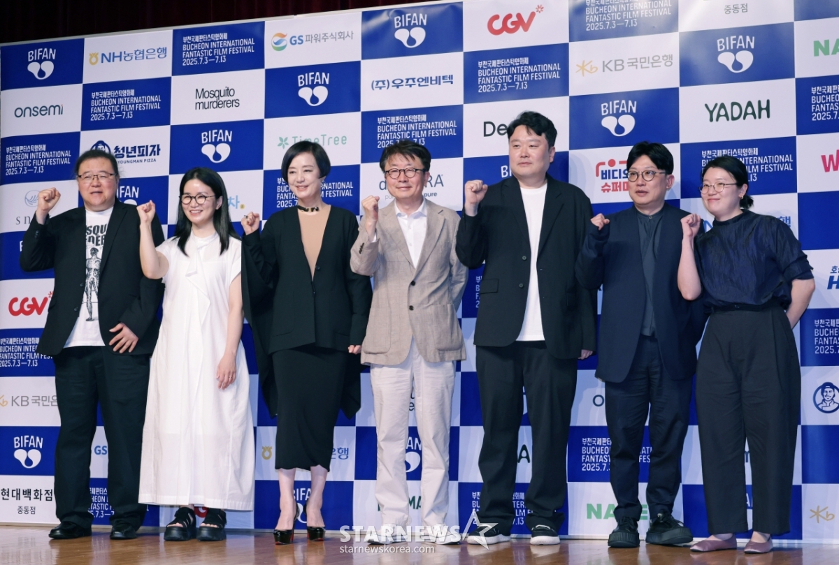 10일 오후 서울 용산 백범김구기념관에서 진행된 제29회 부천국제판타스틱영화제(BIFAN) 공식 기자회견에 참석한 남종석 프로그래머, 박보람 XR큐레이터, 장미희 조직위원장, 신철 집행위원장, 이정엽 프로그래머, 박진형 프로그래머, 김관희 프로그래머(왼쪽부터)가 포즈를 취하고 있다.