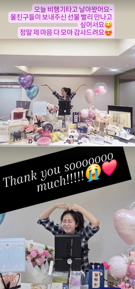 송윤아는 지난 10일 자신의 인스타그램에 "오늘 비행기 타고 날아왔다. 우리 친구들이 보내주신 선물 빨리 만나고 싶어서"라며 "정말 제 마음 다 모아 감사드린다"라는 글과 함께 사진을 공개했다.