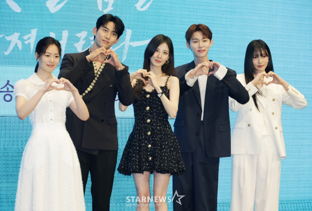 배우 권한솔, 옥택연, 서현, 서범준, 지혜원이 11일 오후 서울 구로구 디큐브시티에서 진행된 KBS 2TV 수목드라마 '남주의 첫날밤을 가져버렸다' 제작발표회에 참석해 포즈를 취하고 있다.