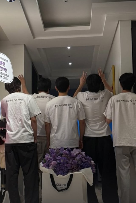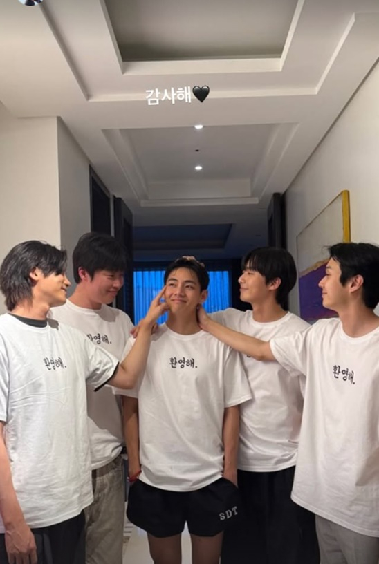 뷔는 11일 자신의 개인계정에 일상 사진을 올렸다. 특히 뷔는 박서준, 최우식, 박형식, 픽보이 등 절친 모임인 '우가팸'을 만나 행복한 모습. 친구들은 "환영해"라고 적혀있는 커플티를 입고 뷔의 전역을 축하했다. 뷔는 "감사해"라며 애정을 드러냈다.