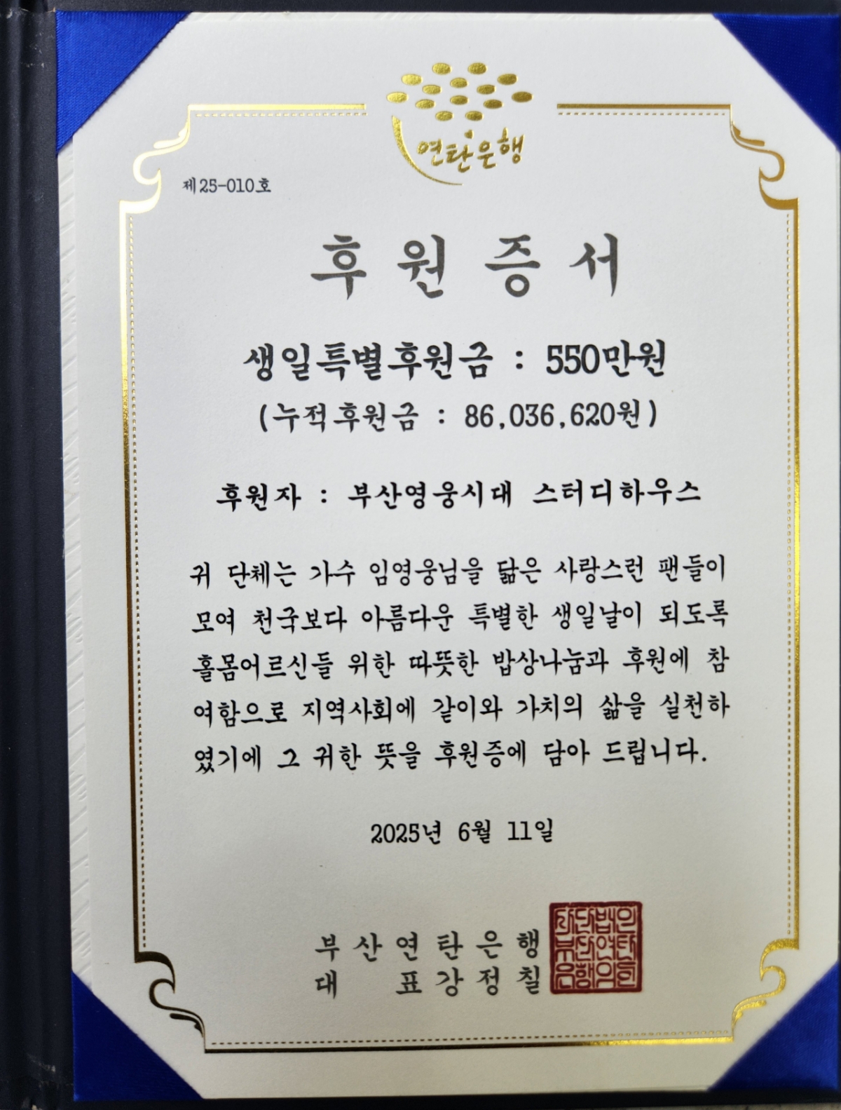 임영웅 팬클럽 부산영웅시대 '스터디하우스'는 지난 11일 부산연탄은행 밥상공동체(대표 강정칠 목사)에서 46차 정기 봉사 활동을 했다. 이번 봉사에서는 임영웅 생일(6월 16일)을 맞아 특별 기부 550만 원을 하고 특별 보양식으로 삼계탕을 제공했다. 부산연탄은행 밥상공동체는 쪽방 거주 독거노인들에게 도시락 나눔 및 연탄 배달하는 봉사단체다.