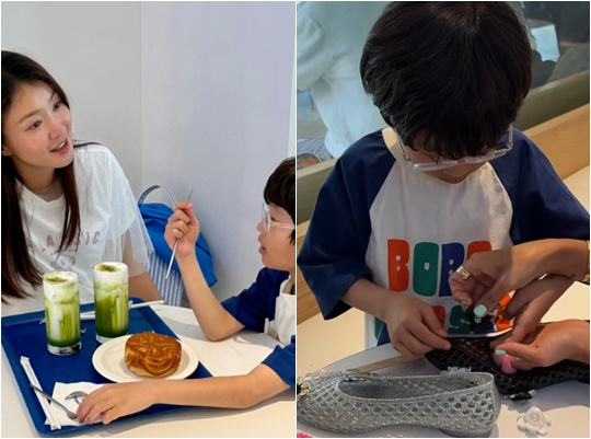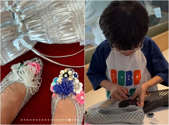 공개된 사진 속에는 젤리 슈즈에 직접 장식을 할 수 있는 매장에서 신발을 고르고 장식하는 이시영과 아들 정윤 군의 모습이 담겼다.