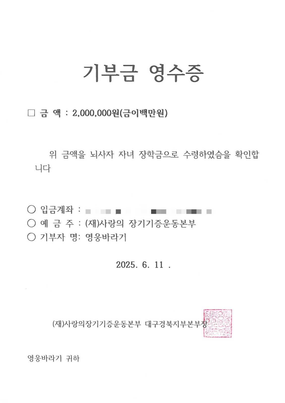 임영웅 팬클럽 대구·포항 영웅시대 영웅바라기는 임영웅의 생일(6월 16일)을 기념해 지난 11일 (재)사랑의장기기증운동본부 대구경북지부에 뇌사자 자녀 장학금 200만 원을 기부했다.