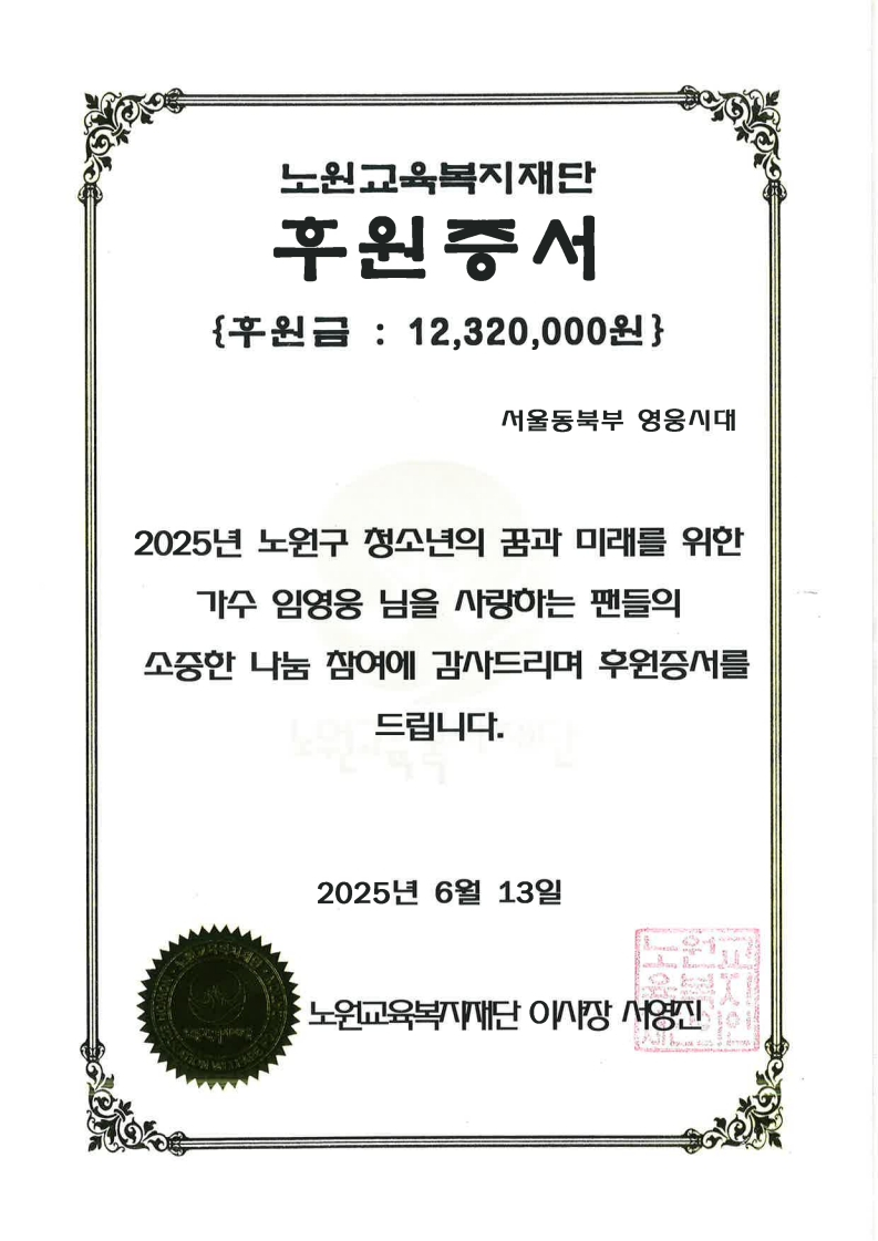 임영웅 팬클럽 서울동북부 영웅시대는 노원구에 거주하고 있는 청소년 및 청년들이 학업에 전념하고, 자신의 꿈과 적성에 따라 보다 나은 미래를 설계할 수 있도록 생활 장학금 1232만 원을 지난 13일 노원구청(구청장 오승록)에 전달했다.