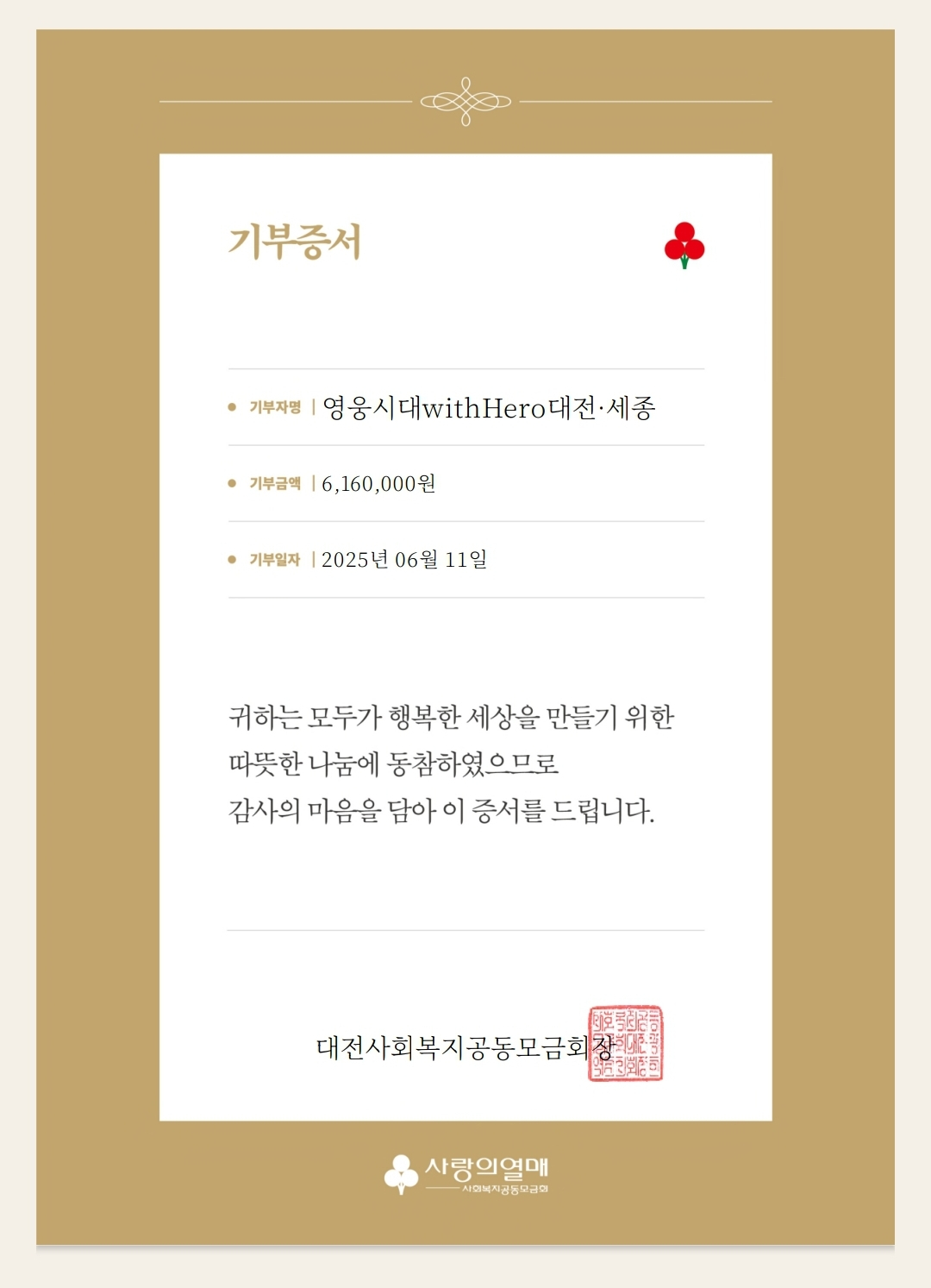 영웅시대withHero 대전·세종은 지난 2020년 동구 한부모 가정을 위한 기탁을 시작으로, 대덕구, 중구, 서구, 세종 지역을 거쳐 이번 유성구 지역까지 누적 4900여만 원을 후원했다.