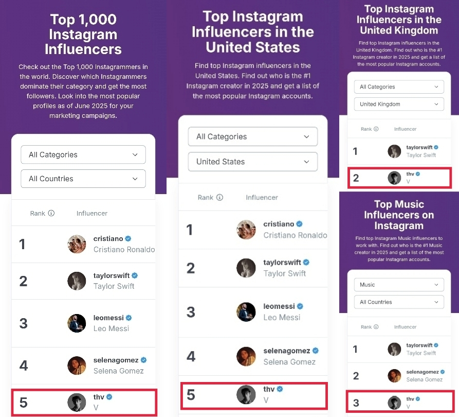 인플루언서 분석업체 하이프오디터에 따르면 뷔는 인스타그램에서 '전 세계에서 가장 영향력 있는 인플루언서 톱 1000' 5위에 오르며 아시아스타 최고 순위를 기록했다. 뷔는 호날두, 테일러 스위프트, 메시, 셀레나 고메즈에 이어 5위에 올랐다.