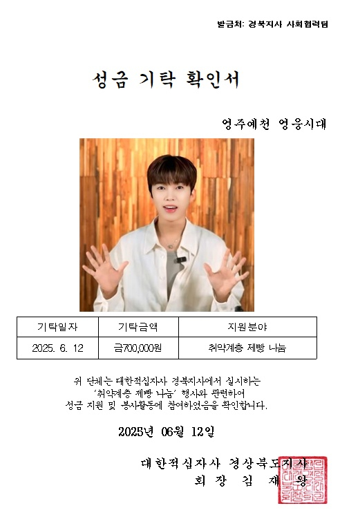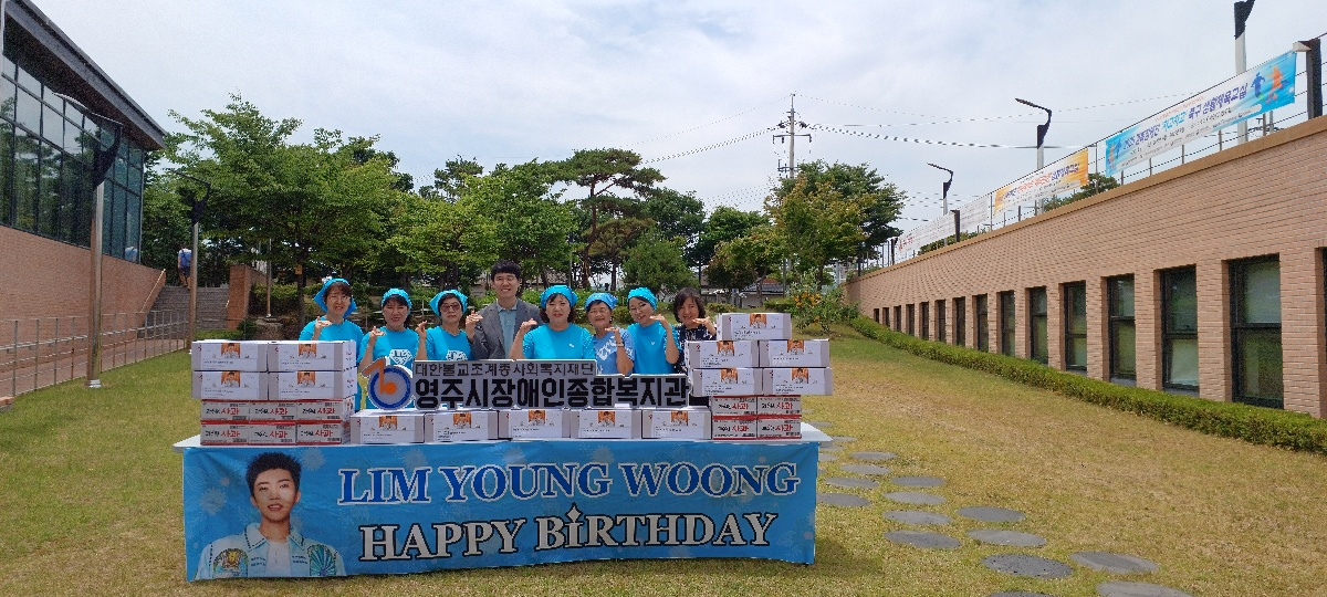 임영웅 팬클럽 '영주·예천 영웅시대'는 임영웅의 생일(6월 16일)을 맞아 지난 12일 대한적십자사 경상북도지사를 통해 지역 장애인들을 위해 빵, 음료, 과일, 과자, 두유 등 70만 원 상당 간식을 기부했다.