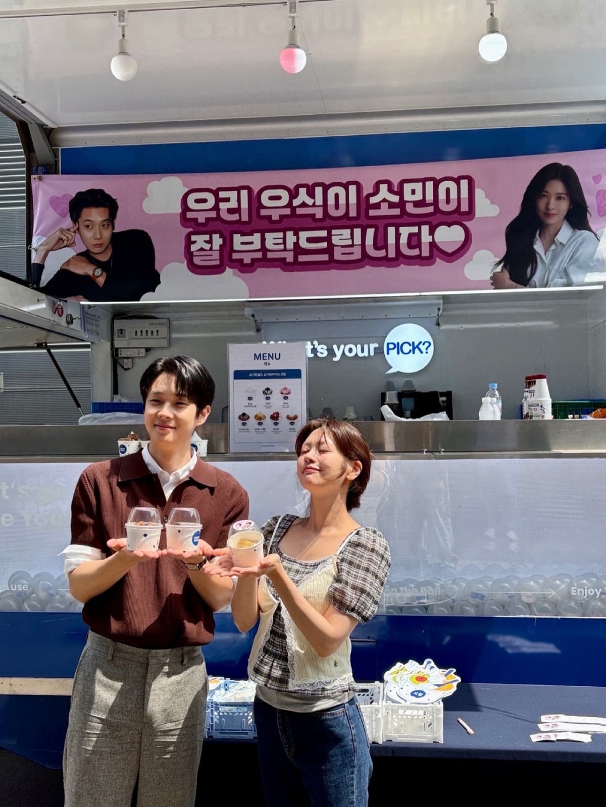 공개된 사진 속 박보영은 최우식, 정소민이 출연하는 드라마 '우주메리미' 촬영장에 아이스크림을 선물한 것으로 보인다. 아이스크림 차에는 '우리 우식이 소민이 잘 부탁드립니다'라고 적혀있다.