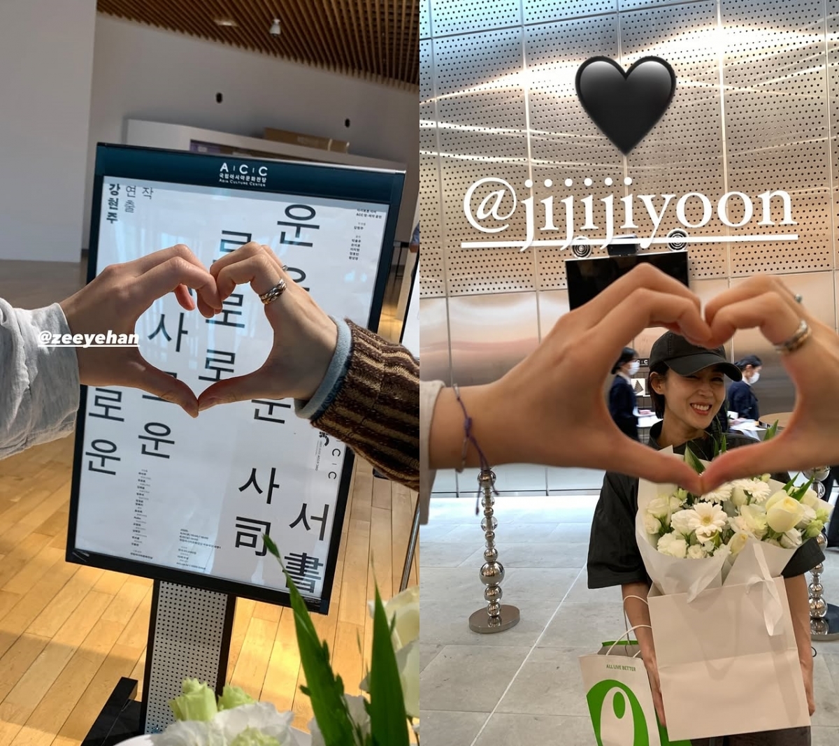 공개된 사진 속에는 '사사로운 사서'를 함께 관람한 듯한 고윤정과 한예지가 포스터 앞에서 손하트를 만들고 있다. 이어 또 다른 사진 속에는 '사사로운 사서'에 출연한 손지윤에게 꽃다발을 선물했고, 손하트를 만들어 애정을 표현했다.