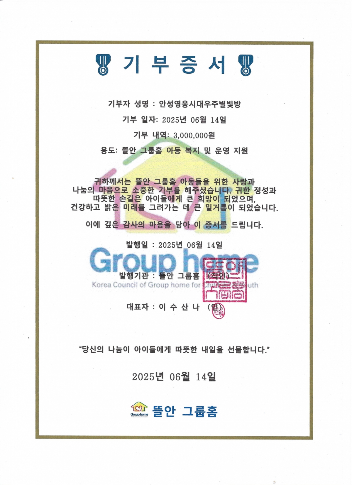 임영웅 팬클럽 안성영웅시대 우주별빛방은 지난 14일 뜰안 그룹홈(대표 이수산나)에 아동 복지 및 운영 지원을 위해 300만 원을 기부했다.
