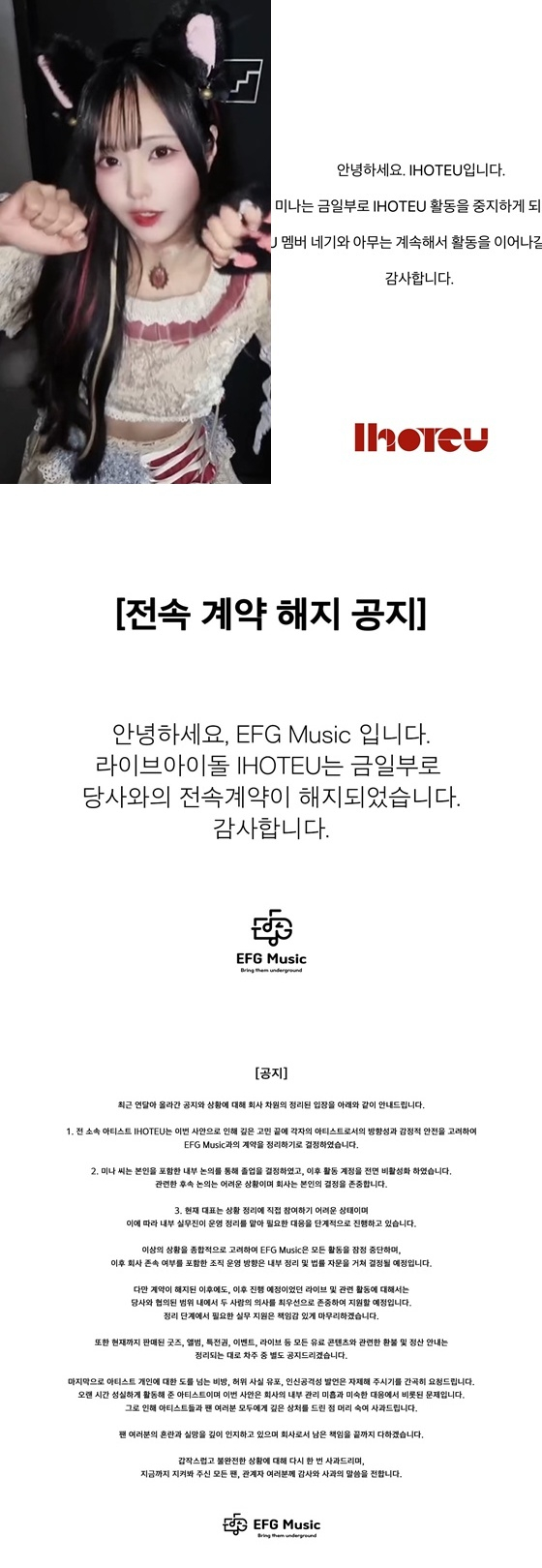 게다가 EFG뮤직마저 업무가 중단됐다. 14일 공식 SNS에 "현재 대표는 상황 정리에 직접 참여하기 어려운 상태이며 이에 따라 내부 실무진이 운영 정리를 맡아 필요한 대응을 단계적으로 진행하고 있다. 이상의 상황을 종합적으로 고려하여 EFG뮤직은 모든 활동을 잠정 중단한다. 이후 회사 존속 여부를 포함한 조직 운영 방향은 내부 정리 및 법률 자문을 거쳐 결정될 예정이다"라는 공지를 띄웠다.