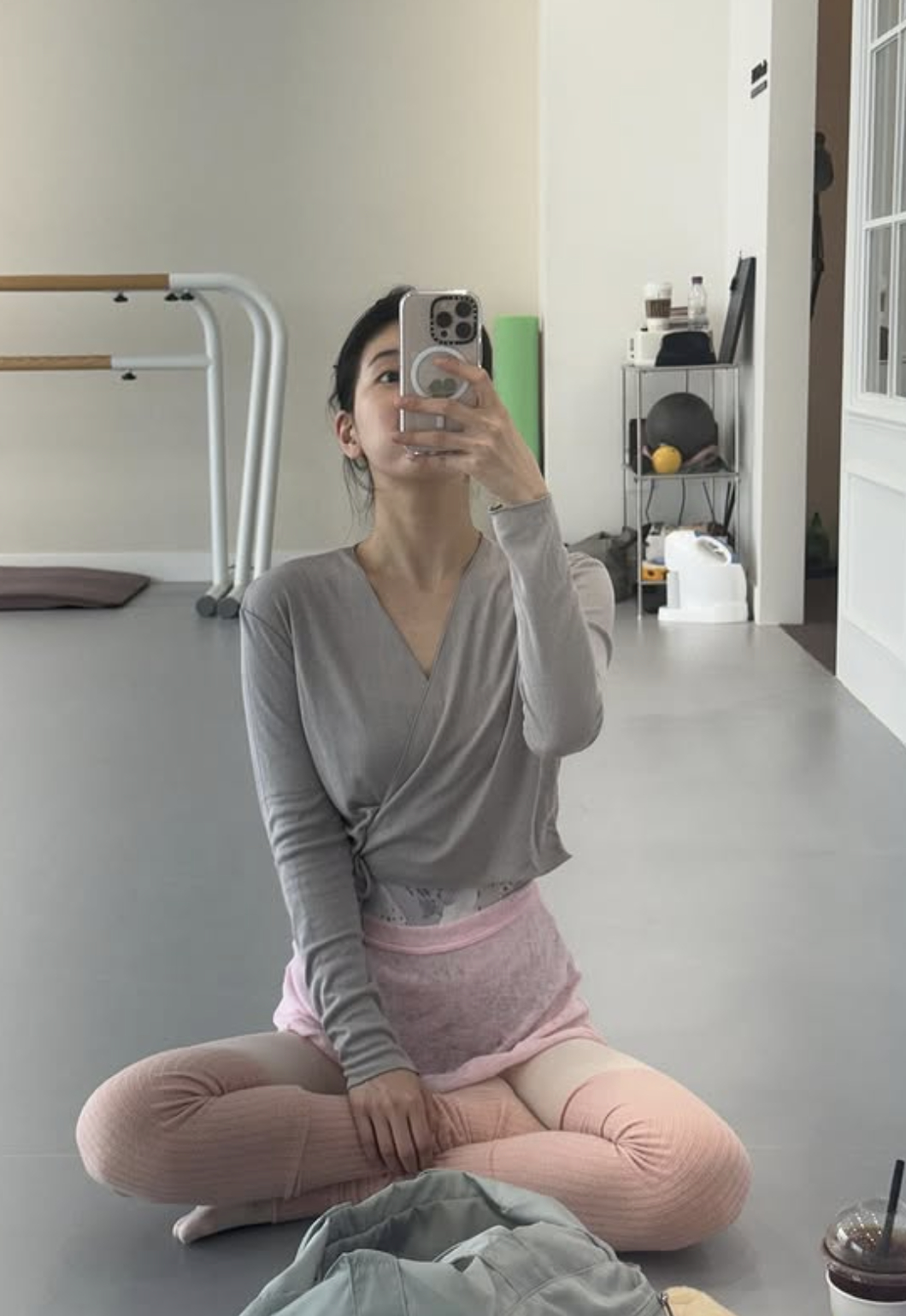 또 다른 사진에서는 거울 앞에 앉아 셀카를 찍는 모습도 담겼다. 연습복 차림에도 무심한 듯 청순한 비주얼이 돋보인다.