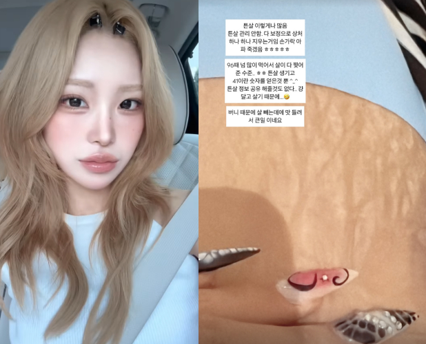 최준희는 19일 자신의 튼살을 공개하고 "튼살 이렇게나 많음. 튼살 관리 안함. 다 보정으로 상처 하나하나 지우는거임. 손가락 아파 죽겠음"이라며 "96kg 때 많이 먹어서 살이 다 찢어진 수준. 튼살 생기고 41이란 숫자를 얻은 것 뿐. 튼살 정보 공유해줄 것도 없다. 그냥 달고 살기 때문에"라고 전했다.