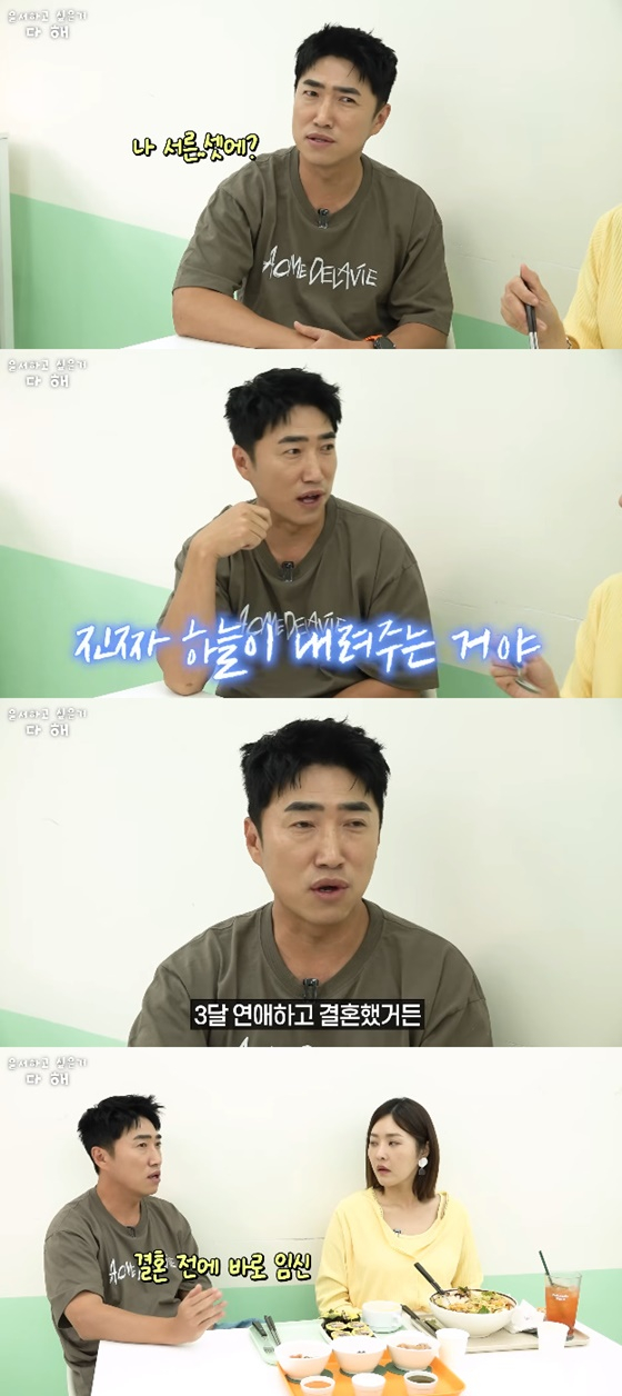 장동민은 "30대 후반 때부터 검사 같은 거 하면 자연 임신이 힘들다고 했다. 물고기도 몇 마리 없다고 했다 "근데 임신은 진짜 하늘이 내려주는 거다. 3달 연애하고 결혼했다. 결혼 전에 바로 임신했다. 둘째도 원샷 원킬이었다"고 밝혔다.