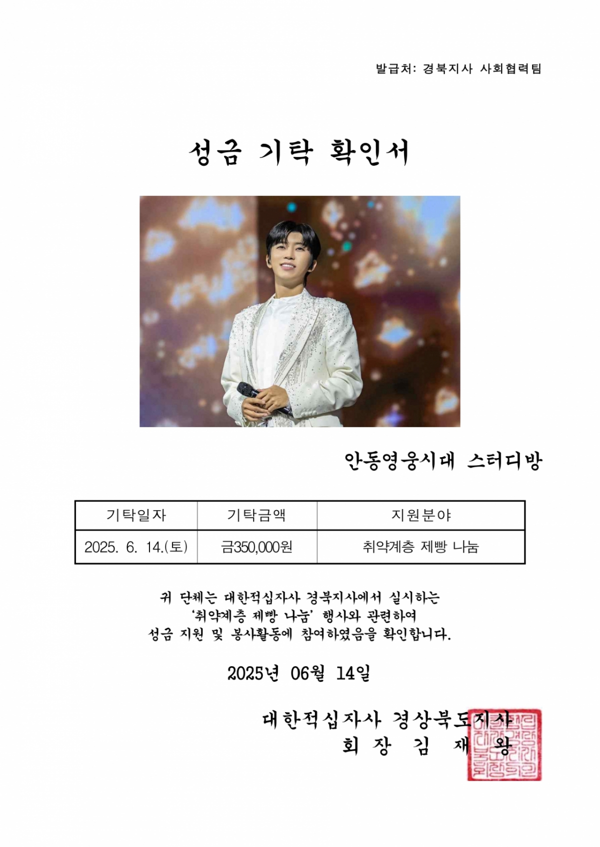 '영웅시대 안동스터디방'은 임영웅의 선한 영향력에 동참하고자 이번 사랑의 제빵 봉사활동을 기획했다. 이에 앞서 지난 14일에는 대한적십자사 경상북도지사에 취약 계층 제빵 나눔을 위해 35만 원을 기탁했다.