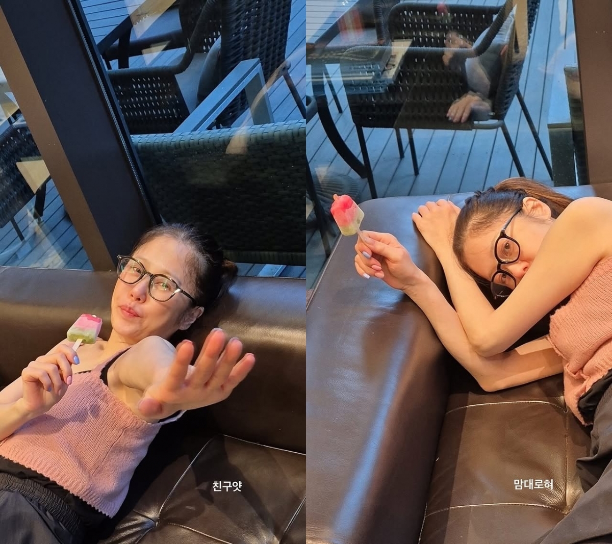 사진 속 고현정은 쇼파에 누워 아이스크림을 먹으며 친구와 장난을 치고 있는 모습. 그는 수수한 민낯에 뿔테 안경을 착용, 질끈 묶은 헤어스타일로 포인트를 주면서 변함없이 아름다운 비주얼을 자랑했다.