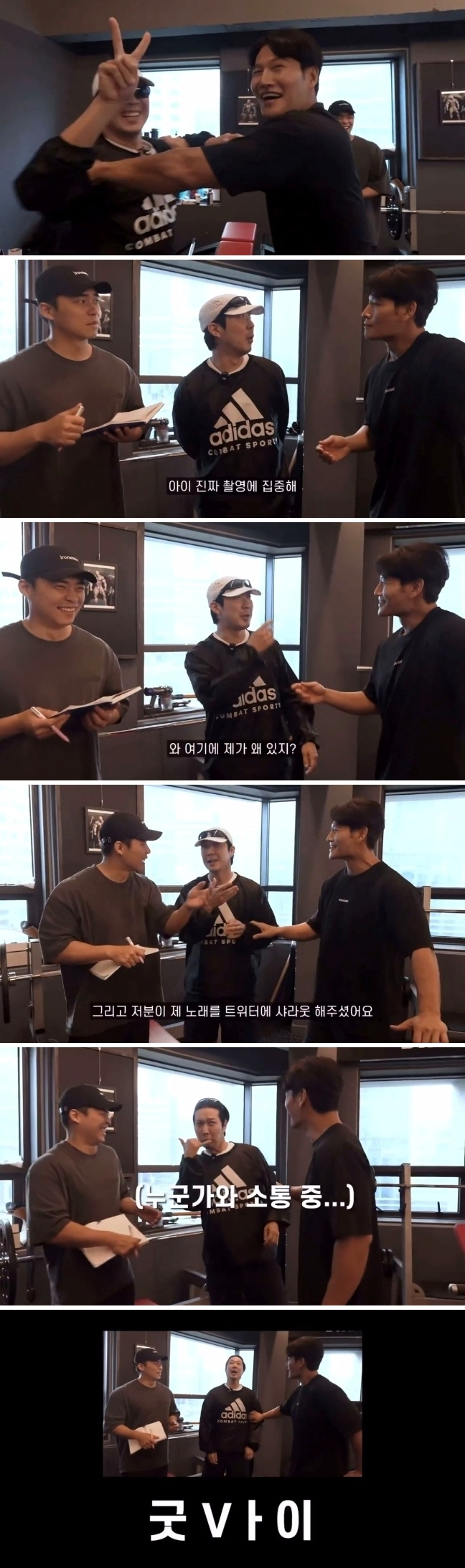 하하가 등장하자 김종국은 누군가가 있다고 귓속말로 전했다. 하하는 카메라 뒤에 있는 뷔의 이름은 말하지 못하고 손으로 브이를 그리며 환하게 웃었다. 하하는 김종국이 촬영에 집중하라는 말에도 계속 뷔를 쳐다보며 "와 여기에 쟤가 왜 있지?"라며 놀라는 표정을 지었다. 이어 "저 분이 제 노래를 트위터(현. X)에 샤라웃 해주셨어요"라며 뷔와의 인연을 추억했다.