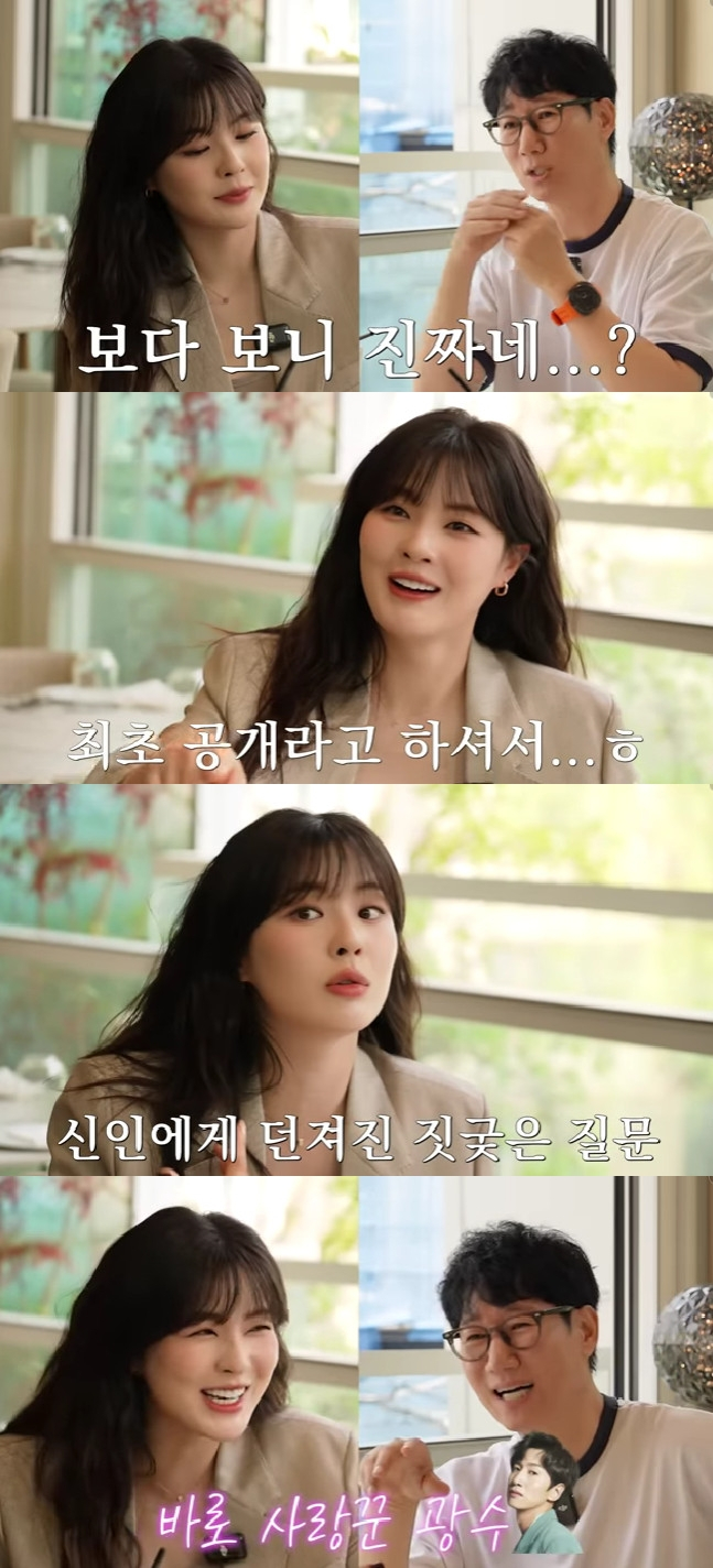 이어 "당시 전 너무 신인이었고, 인터뷰에서 이상형을 물어보니까 진짜 이상형을 말한 거다"라며 "그렇지만 중요한 건 부단히 둘의 관계 발전을 위해 노력한 건 그다. 이상형이라고 먼저 말한 건 저이지만, 먼저 대시한 건 그다. 이건 확실히 해줬으면 좋겠다"고 웃었다. 이에 지석진은 "이건 나도 안다"고 증언했다.