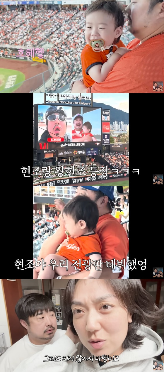 아들 현조 군은 수많은 인파가 몰린 야구장에 입성한 후 어리둥절한 표정을 지었다. 그러나 울지도 않고 미소를 지으며 눈길을 끌었다.
