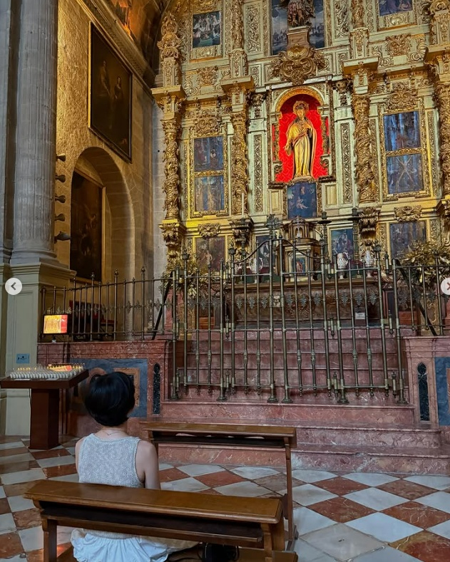 게시물을 본 배우 박효주는 "성당에 앉은 뒷모습 왜 이렇게 귀엽지?"라고 댓글을 달며 친분을 과시했다.