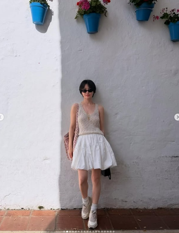 송혜교는 숏커트에 베이지색 민소매 니트, 화이트 벌룬 스커트에 운동화를 매치하고 캐주얼한 패션을 선보였다.