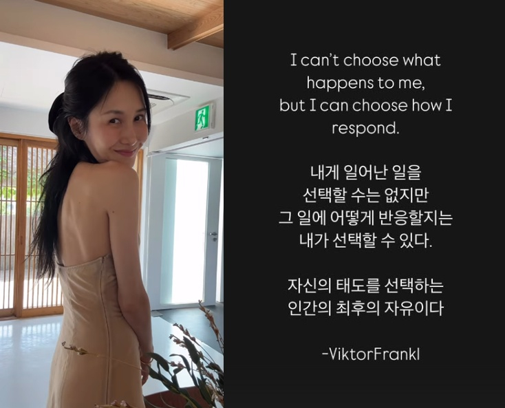 윤혜진은 22일 "내게 일어난 일을 선택할 수는 없지만 그 일에 어떻게 반응할 지는 내가 선택할 수 있다. 자신의 태도를 선택하는 인간의 최후의 자유이다"라는 문구를 게재했다.