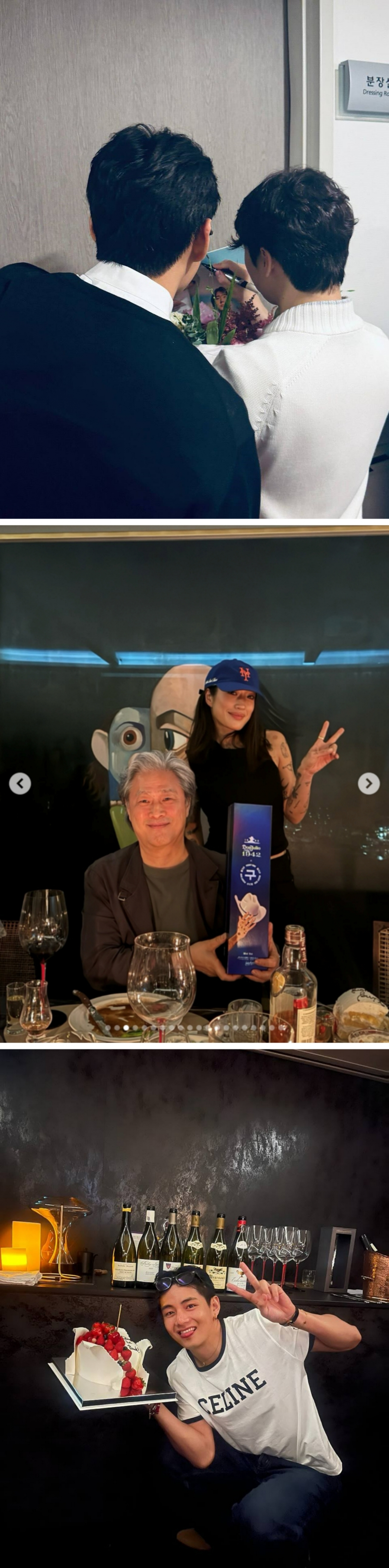 페기 구는 박찬욱 감독과 찍은 사진도 공개했다. 이 사진에는 뷔의 전역을 축하하는 케이크가 보인다. 지난 20일 뷔는 라이브방송에서 전날 전역을 축하해주는 사람들과 와인을 마셨다는 일상을 공유했다.