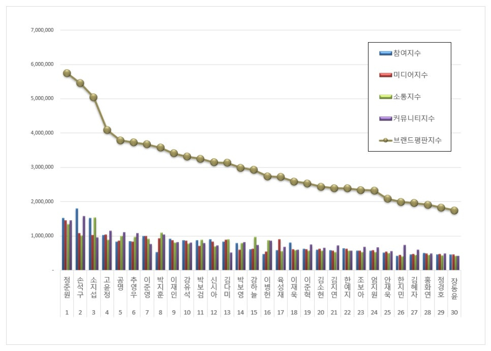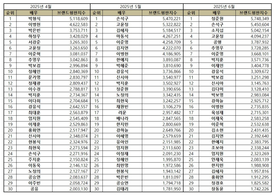 2025년 6월 배우 브랜드평판 30위 순위는 정준원, 손석구, 소지섭, 고윤정, 공명, 추영우, 이준영, 박지훈, 이재인, 강유석, 박보검, 신시아, 김다미, 박보영, 강하늘, 이병헌, 육성재, 이재욱, 이준혁, 김소현, 김지연, 한예지, 조보아, 엄지원, 안재욱, 한지민, 김혜자, 홍화연, 정경호, 장동윤 순이었다.