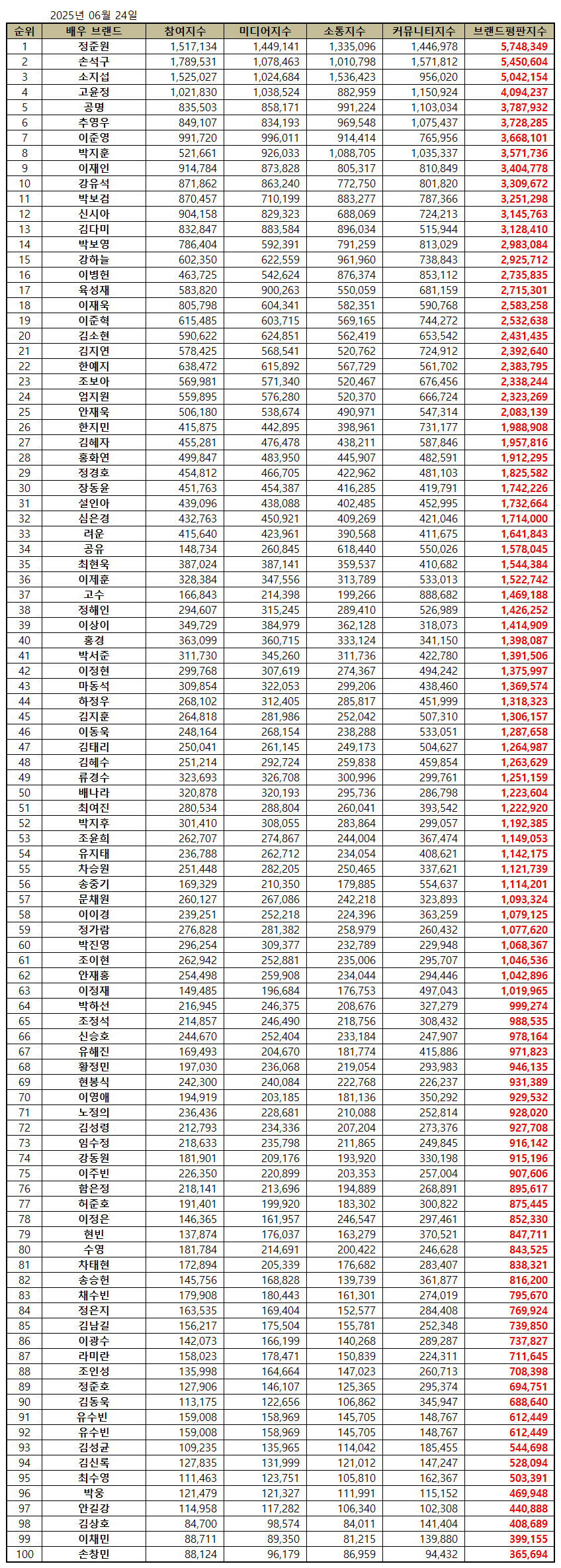 한국기업평판연구소는 2025년 5월 24일부터 2025년 6월 24일까지 방영한 드라마, 영화, OTT에서 출연중인 배우 100명의 브랜드 빅데이터 162,092,347개를 소비자들의 브랜드 참여량, 미디어량, 소통량, 커뮤니티량으로 측정하여 브랜드평판 알고리즘으로 지수화했다. 지난 5월 배우 브랜드 빅데이터 175,223,431개와 비교하면 7.49% 줄어들었다.