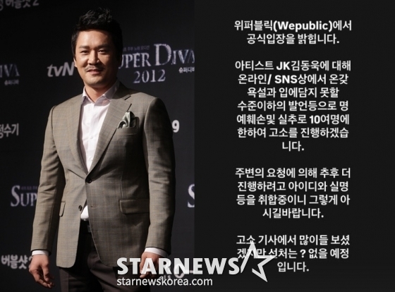 이후 최근 JK김동욱은 12일 소속사를 통해 "온라인 SNS 상에서 온갖 욕설과 입에 담지 못할 수준 이하의 발언 등으로 명예훼손 및 실추로 10여명에 한해 고소를 진행하겠다"라며 "선처는 없을 예정"이라고 전했다.