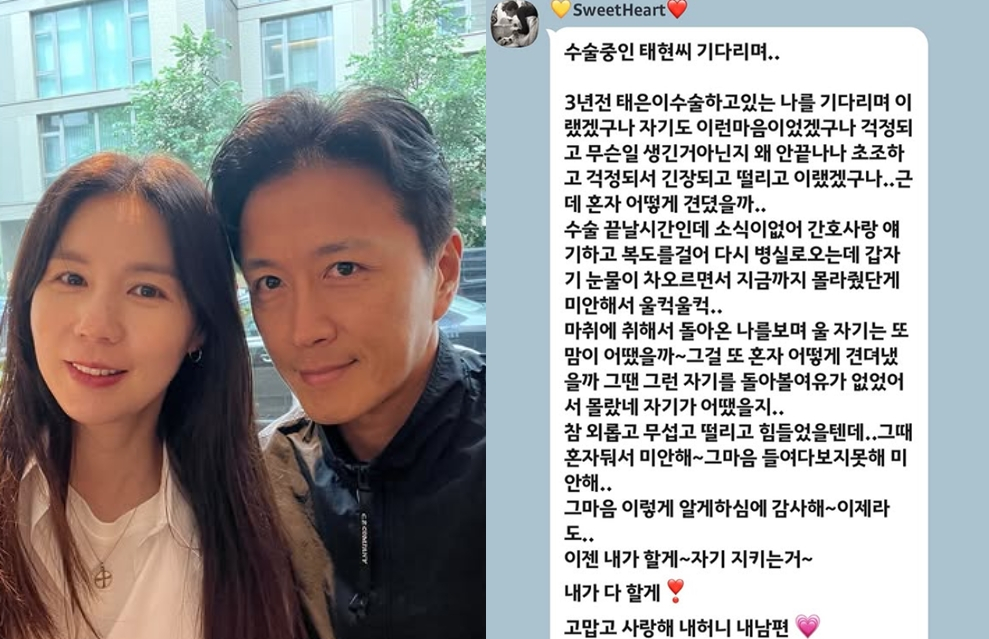 이어 "저의 배우자는 인생에 단 한 명입니다. 제가 한 말의 책임을 다하는 겁니다. 저는 그게 가장 남자다움이라 생각합니다"라며 "수술 후 통증과 긴장으로 긴 밤 잠을 설쳤습니다. 그리고 목이 아플 때마다 아내의 톡을 계속 읽었습니다. 어젯밤 저의 완벽한 진통제였습니다"라고 전했다.
