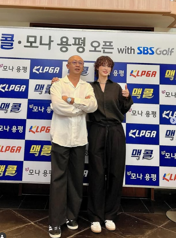 사진 속에는 최여진이 김재욱과 모나 용평 오픈 골프대회에 참석한 모습이 있었다.